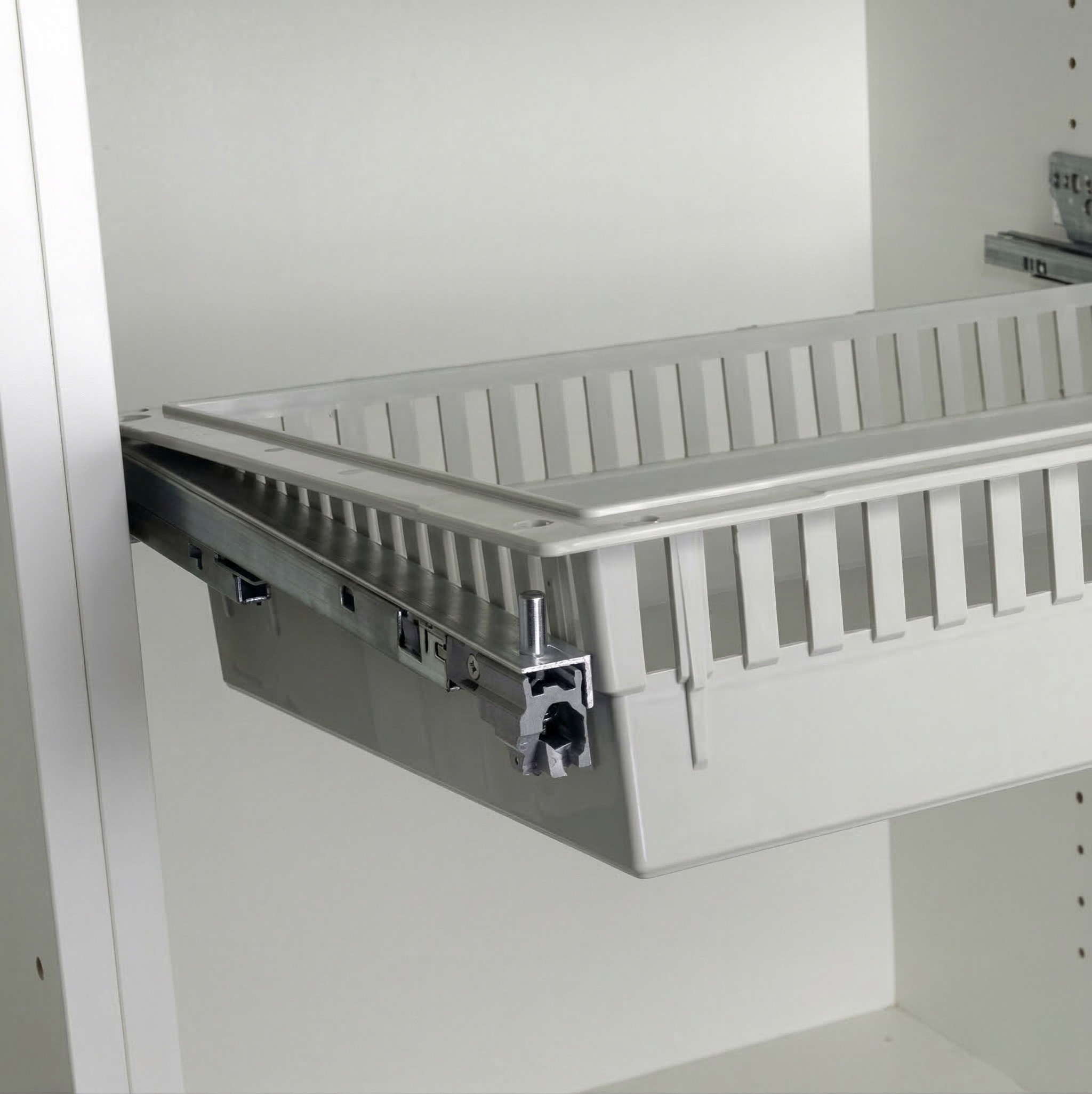 Wannen, Körbe, Tablare, Profilwände, Schrägauszüge, PC-Auszüge: Alles konfigurierbar. Leichtlaufend auch bei wenig Beladung, belastbar mit 40 bis 70 kg pro Auszug. Aufgesetzte Wannen und Körbe sitzen fest: Kein Verrutschen, keine Geräusche. Kompatibel mit allen gängigen Anbietern.