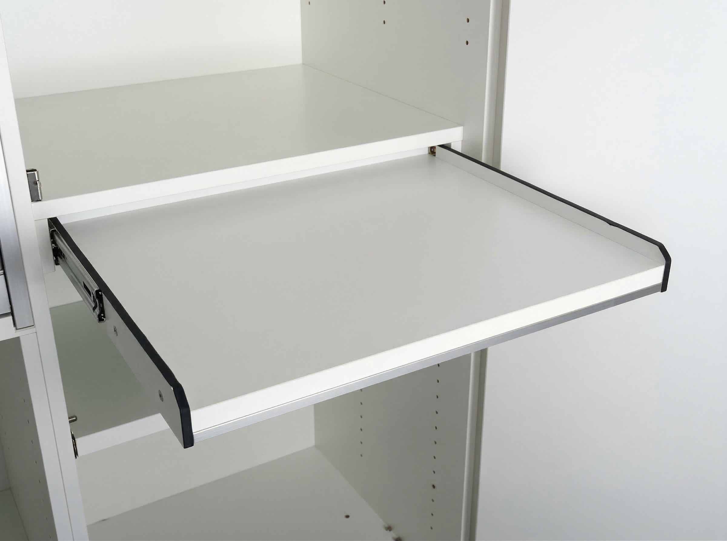 Arbeitsflächen mit dreiseitigem Stehboard: Dokumente und Rezepte können nicht unter den Auszug rutschen. Vollauszug mit Selbsteinzug und Arretierung im ausgezogenen Zustand. Die Fläche bleibt stabil, auch wenn beide Hände beschäftigt sind.